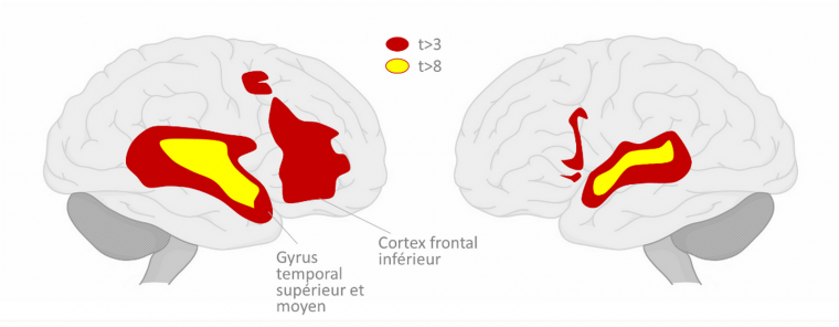 On observe de fortes réponses dans le cortex frontal inférieur et le gyrus supérieur et moyen temporal. Les zones colorées correspondent aux aires cérébrales qui sont aussi bien activées lors de l’écoute de paroles que lors de celle d’une musique. On observe ici une activation plus forte et plus étendue dans l’hémisphère droit que dans le gauche. D’après [44].