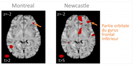 Les zones colorées correspondent à des zones où une augmentation de concentration de matière blanche est associée à une augmentation du score au test de violation mélodique. Ces résultats, obtenus à partir de mesures réalisées chez des patients amusiques et témoins, indiquent qu’une cause de l’amusie pourrait provenir d’une faible concentration en matière blanche du cortex frontal inférieur de ces sujets, marqué d’une flèche jaune sur les images cérébrales. D’après [71].