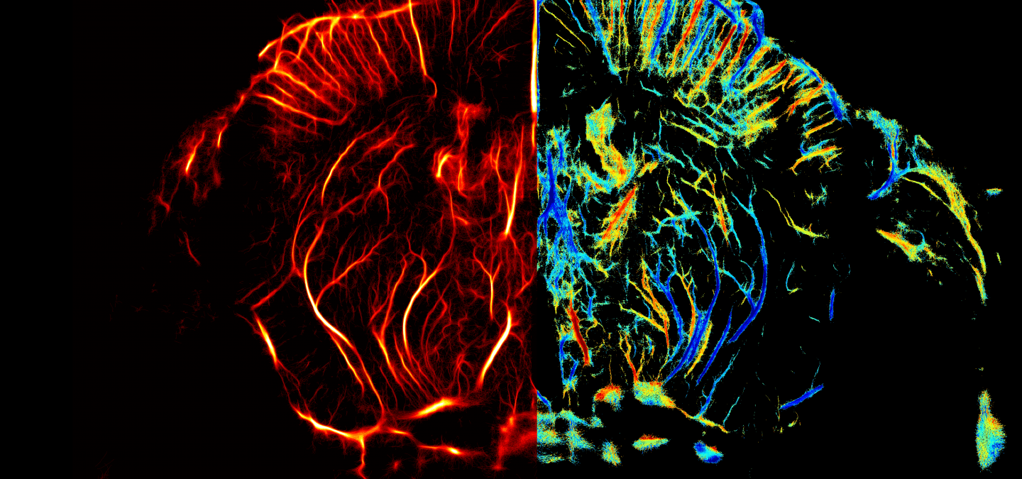 B. L’imagerie fonctionnelle ultrasonore permet de mesurer sur un plan 2D (ici coronal) les changements de volume sanguin dans les vaisseaux du cerveau de petits animaux. Ces changements se produisent suite à des changements d’activité cérébrale et permettent de subvenir aux besoins énergétiques des régions très actives.