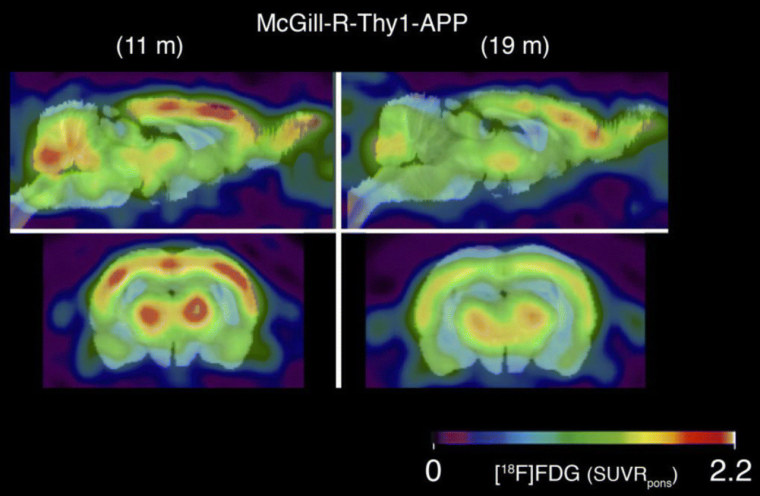 Des rats modèles pour la maladie d'Alzheimer (rats transgéniques McGill-R-Thy1-APP) ont été imagé deux fois, à 11 mois (à gauche) et 19 mois (à droite), en vues sagittale (en haut) et coronale (en bas). Le suivi temporel met en évidence une nette diminution de la fixation du radiotraceur utilisé, le [18F]FDG, dans le cerveau des rats, révélant une baisse du métabolisme cérébral provoqué par la progression de la maladie.