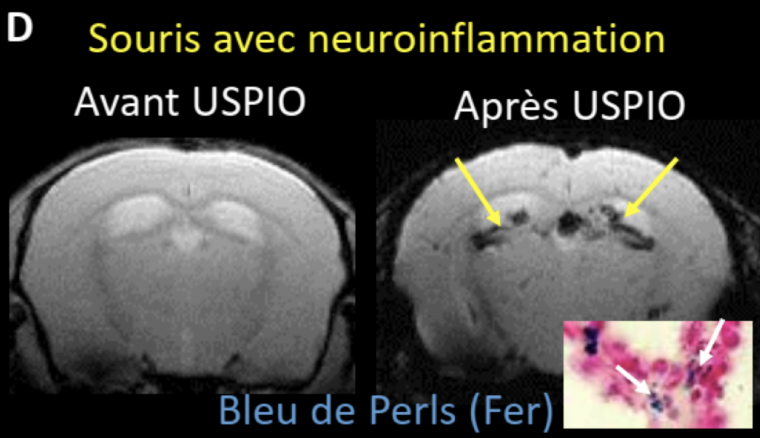 Cerveau d’une souris avec un modèle de neuro-inflammation imagée in vivo par imagerie par résonance magnétique (IRM) avant et après administration de nanoparticules d’oxyde de fer (USPIO). En présence d’inflammation et avant l’administration d’USPIO, le cerveau apparaît identique à celui de la souris saine. Après l’administration d’USPIO, des signaux hypointenses sont visibles au niveau des plexus choroïdes, indiqués par les flèches. Ces signaux proviennent de l’internalisation des USPIO par les cellules immunitaires (macrophages) et mettent donc en évidence la présence d’un phénomène inflammatoire. L’histologie (insert) confirme que ces signaux proviennent du fer des USPIO (coloration au bleu de Perls, flèches).