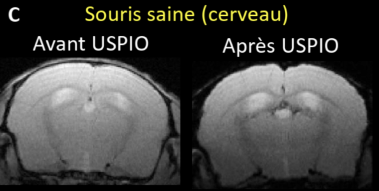 Les figures 1 à 4 présentent des résultats d’IRM réhaussées avec des nanoparticules d’oxyde de fer (USPIO). Dans le cerveau d’une souris présentant une neuroinflammation (Figures 3 et 4), les signaux hypointenses (noirs) proviennent de l’internalisation des USPIO par les cellules immunitaires (macrophages) et mettent donc en évidence la présence d’une réaction inflammatoire.