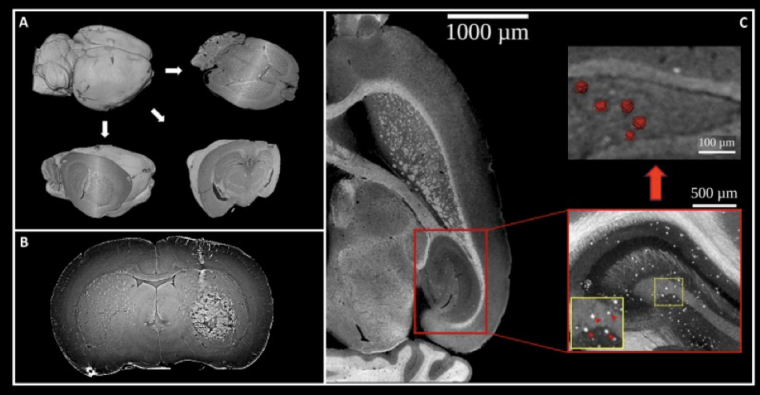 La figure 7 montre des exemples d’images, sur des modèles animaux de tumeur cérébrale (image B) et de maladie d’Alzheimer (image C). L’intérêt principal est l’étude de la morphométrie (géométrie 3D) des objets pathologiques (la tumeur, les plaques amyloïdes), qui est rendue possible, car l’organe a été scanné sans être altéré.