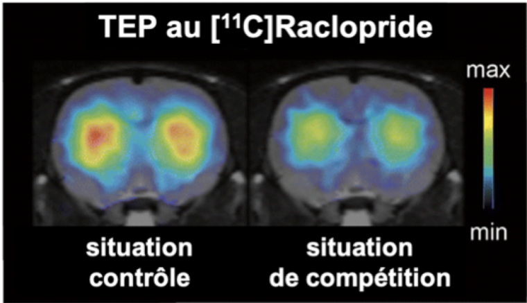 Le radiotraceur [11C]Raclopride est utilisé pour visualiser les récepteurs de la dopamine. Ceux-ci sont également les cibles de drogues psychostimulantes telles que la cocaïne ou les amphétamines. Lorsque les amphétamines sont injectées juste avant le radiotraceur, les deux molécules sont en compétition au niveau des récepteurs de la dopamine, provoquant ainsi la baisse de signal observée (image de droite).
