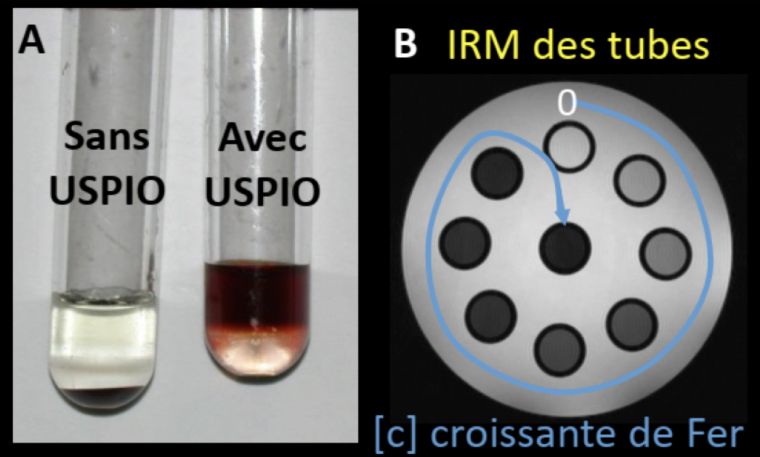 A. Les USPIO sont des nanoparticules d’oxyde de fer (diamètre < 50 nm) qui se présentent sous forme de solution colloïdale. Le tube de droite montre la couleur « rouille » de la solution en comparaison avec un tube sans USPIO.
