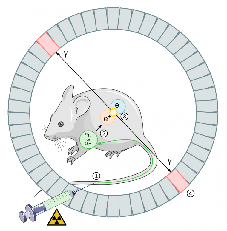 Source des schémas utilisés : Souris : Servier, CC-BY, Bioicons ; Seringue : Servier, CC-BY, Bioicons ; Icône radioactivité : Cary Bass, CC0, Wikimedia.