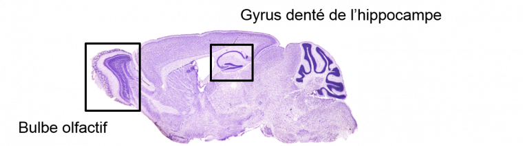 Exemple chez le rongeur. Les zones de neurogenèse adulte principales sont l’hippocampe et le bulbe olfactif. Coupe sagittale de cerveau de rats. Coloration de Nissl (crésyl violet) qui permet de mettre en évidence les neurones.