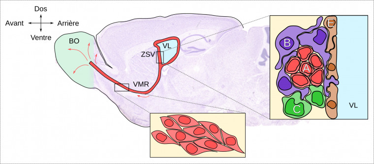 Concernant le bulbe olfactif, les nouvelles cellules sont d’abord produites dans la zone sous-ventriculaire (ZSV) à partir des cellules souches (cellule de type B, figure 2, médaillon de droite) qui prolifèrent. Ces cellules donnent naissance à des cellules progénitrices transitoires (cellule de type C, figure 2), elles-mêmes capables de proliférer et de se différencier en neuroblastes (figure 2). Chez les rongeurs, la zone sous-ventriculaire est la source la plus importante de nouvelles cellules dans le cerveau adulte avec plusieurs dizaines de milliers de cellules générées quotidiennement. Ces nouvelles cellules migrent ensuite le long de la voie de migration rostrale (VMR, figure 2, médaillon du bas), sur plusieurs millimètres, pour atteindre le bulbe olfactif où ils achèvent leur processus de maturation et deviennent majoritairement des interneurones GABAergique, et pour une très faible proportion en neurones dopaminergique (5 %). Ces nouveaux neurones fonctionnels s’intègrent alors dans les circuits préexistants du bulbe olfactif pour participer à son fonctionnement.