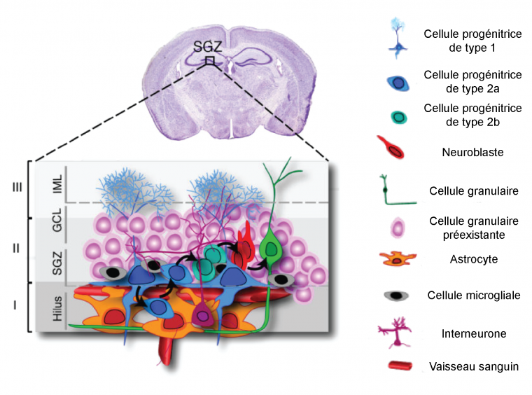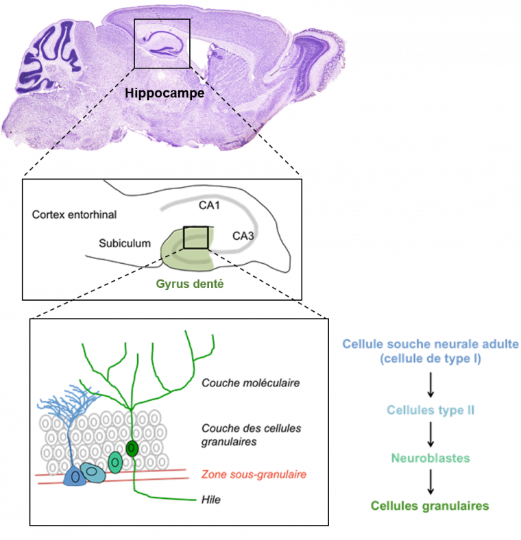 Bas : Gyrus denté de l’hippocampe. Les cellules souches neurales se divisent afin de donner naissance aux neuroblastes, qui deviennent matures et migrent au sein de la couche granulaire du GD puis sont sélectionnées pour s’intégrer au sein des réseaux neuronaux préexistants.