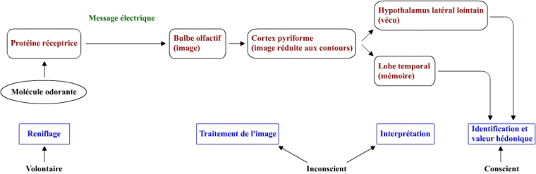 La liaison des molécules odorantes sur leurs récepteurs va entraîner la création de potentiels d’actions à la surface des neurones olfactifs dont les projections sont situées au niveau du bulbe olfactif. Les différents neurones ainsi stimulés génèrent une image topographique correspondant à une carte d’activation de l’épithélium olfactif. Cette image brute va ensuite être traitée dans le cerveau avec intervention de différentes aires (voir figure ci-dessous), ce qui va permettre l’identification consciente de la molécule et l’attribution d’une valeur hédonique.