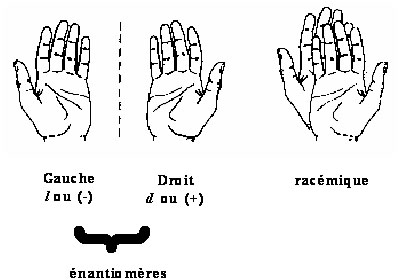 Les mains sont des objets chiraux. Un mélange de deux énantiomères, molécules images l'une de l'autre dans un miroir plan mais non superposables, est dit racémique.