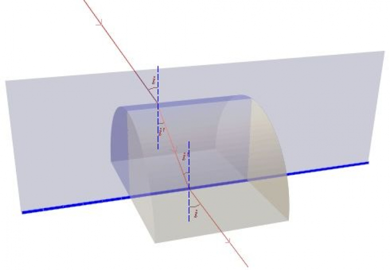 Un rayon lumineux passant par le plan perpendiculaire au plan de coupe du cylindre et passant par l’axe de la lentille (plan bleuté) n’est pas dévié après passage par la lentille (la normale au dioptre d’entrée du rayon lumineux est parallèle à la normale au dioptre de sortie, comme dans le cas d’une lame à faces parallèles). Un rayon lumineux passant hors de ce plan est dévié.