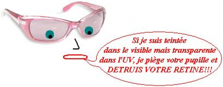 Cependant des lunettes de soleil de mauvaise qualité peuvent avoir un effet dramatique : si vos lunettes de Soleil ne sont pas de véritables lunettes prévues pour protéger vos yeux des UV solaires, mais seulement des verres teintés, porter ces lunettes peut être encore plus dangereux que de ne rien porter. En effet, des verres teintés qui diminuent la luminosité dans le visible amènent la pupille à se dilater, laissant ainsi passer plus de lumière et en particulier plus de rayonnements ultraviolets dangereux pour la rétine ; par conséquent si vos verres teintés diminuent la luminosité dans le visible mais ne sont pas conçus pour protéger efficacement des UV, votre rétine reçoit encore plus d’ultraviolets lorsque vous les portez que si vous ne les mettez pas !