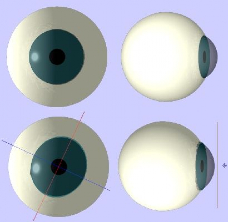 Schéma en bas à droite : l'œil astigmate précédent vu suivant l'axe bleu (on voit donc la cornée dans le plan dans lequel elle est la plus déformée