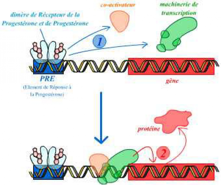 Plus précisément, le dimère de PR-progestérone se fixe sur des segments spécifiques de l’ADN, nommés PRE (Progesterone Responsive Elements : éléments de réponse à la progestérone). La fixation sur l’ADN du dimère PR-progestérone permet le recrutement des coactivateurs de transcription, et de la machinerie transcriptionnelle (voir (1) sur la figure 1). La progestérone agit donc sur l’expression de gènes, via l’activation de leur transcription.