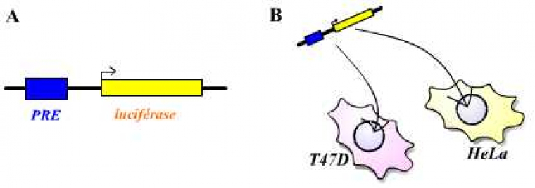 (A) Construction réalisée : le gène de la luciférase est placé sous le contrôle d’un élément de réponse à la progestérone (PRE).
