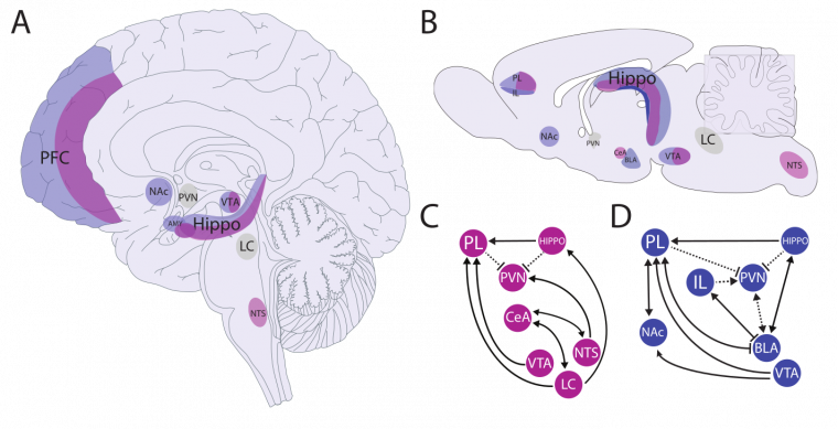 Le cortex préfrontal est essentiel pour développer des réponses appropriées aux agents stresseurs, qu’ils soient physiques ou psychologiques. Il est fortement innervé par des projections dopaminergiques provenant de l’aire tegmentale ventrale (VTA) et du noyau accumbens (NAc). La perturbation du cortex préfrontal est associée à l’anhédonie et à des comportements aberrants de recherche de récompense.