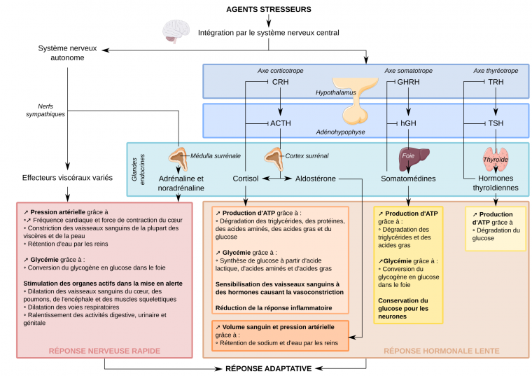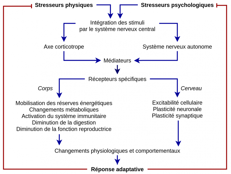 Un agent stresseur est un stimulus d’origine physique ou psychologique qui perturbe l’état d’équilibre de l’organisme. La réponse à cet agent est appelée stress aigu et permet, via l’axe corticotrope (ou hypothalamo-hypophyso-surrénalien) et le système nerveux autonome, de mettre en place un nouvel état d’équilibre. Lorsque la situation stressante est d’intensité trop élevée ou dure trop longtemps, l’allostasie ne peut être atteinte et le stress chronique peut alors être à l’origine de certaines pathologies, révéler des pathologies sous-jacentes, voire impacter les générations suivantes. Pour limiter les effets délétères du stress, il est donc primordial de mettre en place des traitements, que ceux-ci soient médicamenteux (par exemple, β-bloquants) ou non (par exemple, thérapies cognitives et comportementales).