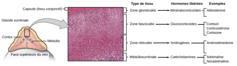 Le soutien métabolique de cette course active est assuré par la mobilisation des réserves de l’organisme. En effet, le stock de glycogène musculaire n’est pas suffisant pour assurer une activité musculaire contractile de longue durée. D’autres réserves, telles que le glycogène hépatique ou les triglycérides du tissu adipeux, sont alors mises en jeu pour permettre aux cellules musculaires de produire suffisamment d’ATP. Ce sont surtout les glandes surrénales (figure 2) qui sont impliquées dans cette mobilisation des réserves énergétiques : la partie corticale comme élément de l’axe corticotrope (sécrétion de glucocorticoïdes) et la partie médullaire sous contrôle du système nerveux autonome (sécrétion d’adrénaline). Lorsque le stimulus stresseur est maintenu plus longtemps, la réponse métabolique peut être entretenue par la mise en jeu plus tardive des axes somatotrope et thyréotrope2 dont les hormones exercent aussi des effets métaboliques (figure 3).
