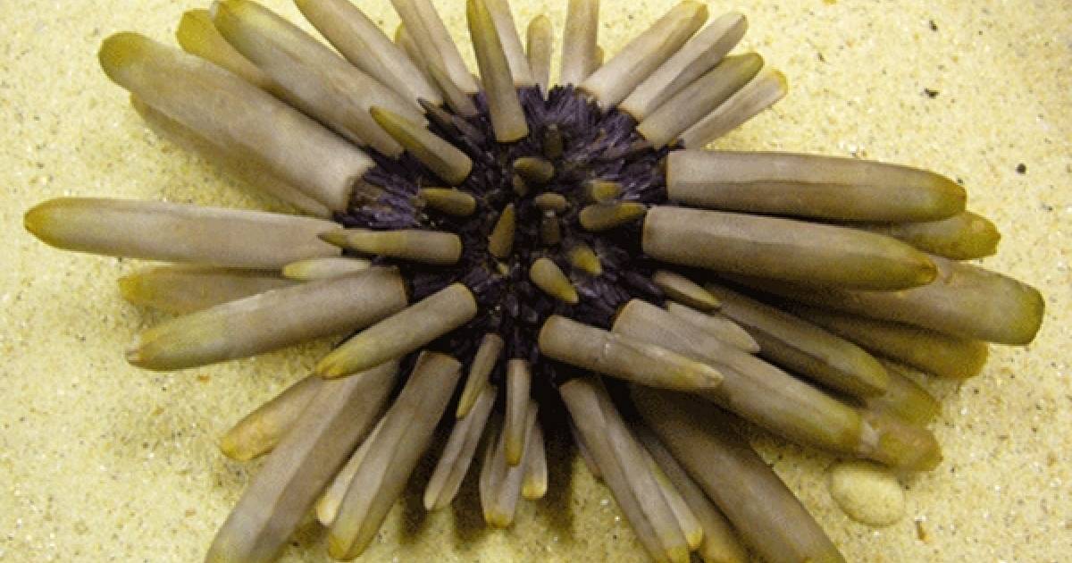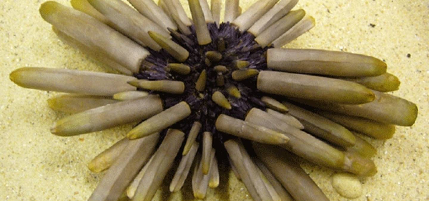 Cette photographie d’un oursin du genre Heterocentrotus montre un échinoderme de très grande taille : 25 cm dans le plus grand axe et 5 cm de hauteur environ, pour le spécimen présenté.