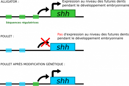 En particulier, le facteur de transcription Shh (Sonic hedgehog) n’est pas présent au même endroit chez le poulet mutant et chez le poulet sauvage. Cette différence de localisation de la protéine Shh est due à une modification d’une des séquences activatrices du gène ssh chez le poulet mutant. Pour obtenir un poulet à dents, il faut modifier cette séquence activatrice dans le génome du poulet. Mais, pour ne pas tuer l’embryon en reproduisant le même phénotype que chez le mutant, il faut confiner l’expression de shh au territoire voulu et la limiter dans le temps. Étant donné que cette molécule est exprimée « au bon endroit » et « au bon moment » chez les alligators, il serait possible d’utiliser leur(s) séquence(s) régulatrice(s), qu’il faudrait d’abord identifier.