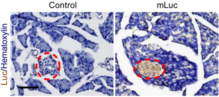 Des nanoparticules lipidiques contenant de l'ARNm codant la luciférase (mLuc) ont été injectés par voie intrapéritonéale à des souris. Les souris témoins ont été injectées avec une solution saline. Six heures plus tard, les souris ont été euthanasiées, et leurs pancréas fixés et congelés. Les lames minces ont été colorées à l'hématoxyline tandis que la luciférase est révélée par immunohistochimie. Les ovales rouges indiquent les îlots de Langerhans. Barre d'échelle : 100 µm.