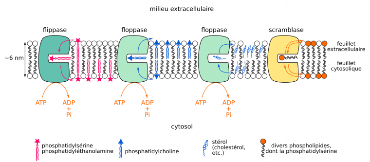 Trois types de protéines permettent les flip-flops de certains lipides membranaires : les scramblases, les flippases (stricto sensu), et les floppases1 (Figure 10). Les quelques scramblases connues sont des protéines transmembranaires capables de transférer des phospholipides d’un feuillet à l’autre sans couplage à une source d’énergie. Ces transferts ne sont pas directionnels et sont peu spécifiques : les scramblases, une fois activées, homogénéisent la composition des deux feuillets membranaires en phosphatidylsérine et phosphatidyléthanolamine [54,55]. Les flippases et les floppases sont capables d’échanges directionnels de lipides entre feuillets, par couplage à l’énergie dégagée par l’hydrolyse de l’ATP. Mais alors que les flippases déplacent principalement la phosphatidylsérine et la phosphatidyléthanolamine depuis le feuillet extracellulaire vers le feuillet cytosolique de la membrane plasmique [56,57], les floppases déplacent le cholestérol2 et la phosphatidylcholine du feuillet cytosolique vers le feuillet extracellulaire/luminal3 [58,59].
