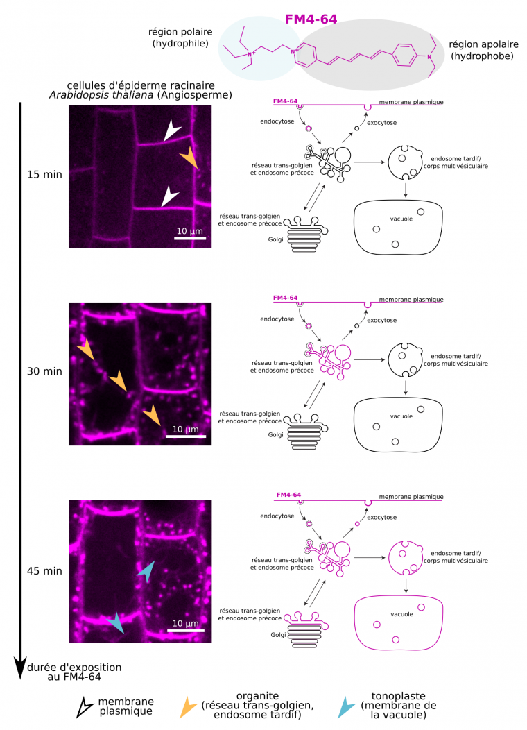 Le FM4-64 est un composé amphiphile fluorescent s’insérant dans la membrane plasmique. Au cours du temps, on constate qu’il est transporté vers d’autres membranes du système endomembranaire (réseau trans-golgien, endosomes, tonoplaste).