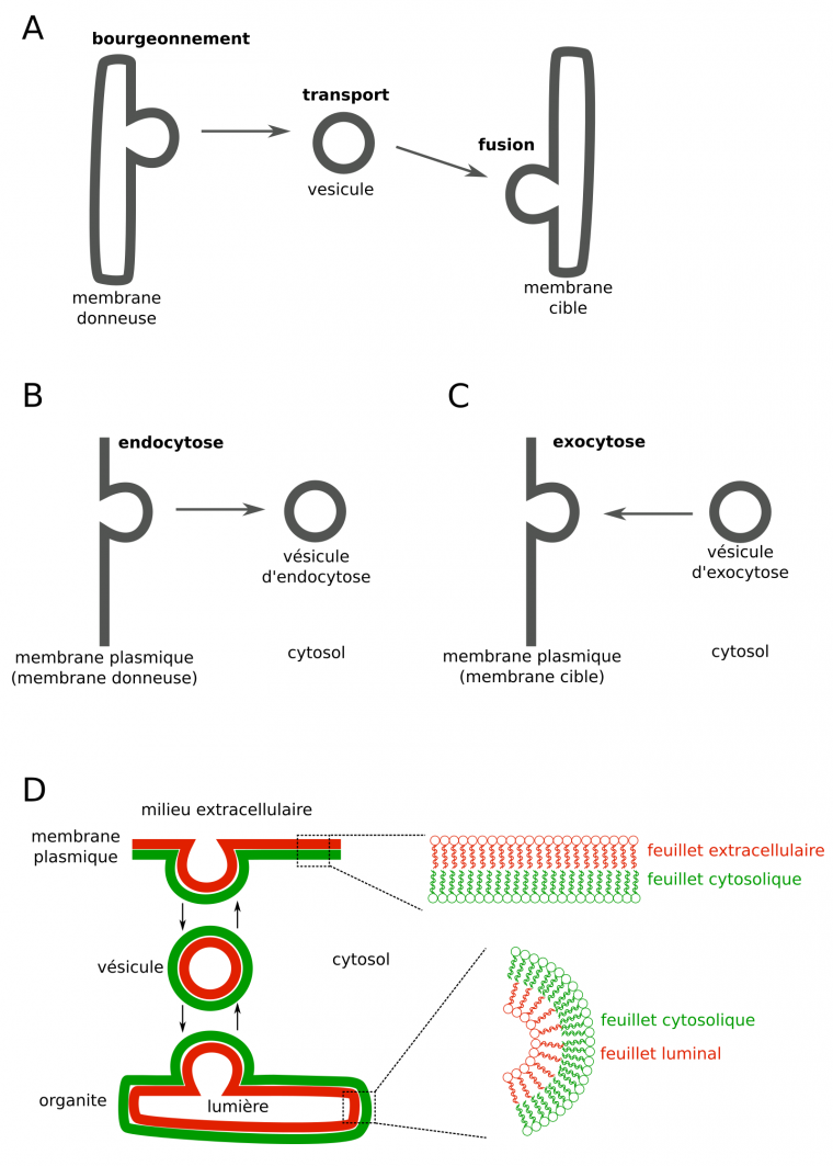 (A) Cas général. (B) Endocytose : bourgeonnement de la membrane plasmique. (C) Exocytose : fusion avec la membrane plasmique. (D) Le feuillet cytosolique et le feuillet luminal/extracellulaire restent les mêmes lors du trafic vésiculaire.