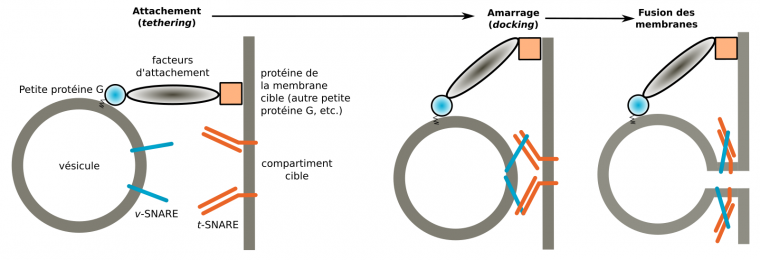 Les vésicules, les membranes d’organites et la membrane plasmique portent des protéines spécifiques, souvent de petites protéines G, qui s’associent spécifiquement à de longues protéines (~300 nm) appelée facteurs d’attachement. Ces derniers permettent l’attachement (tethering) de la vésicule à la membrane cible et son rapprochement vis-à-vis de celle-ci [63-66]. La spécificité de l’interaction entre protéines G de la membrane vésiculaire, facteur d’attachement, et déterminant de la membrane cible (une autre petite protéine G par exemple) participent à l’adressage des vésicules à une membrane cible donnée. Ensuite, des protéines appelées SNARE (v-SNARE sur la vésicule, t-SNARE sur la membrane cible) vont, si elles sont complémentaires, s’associer et amarrer la vésicule à la membrane cible (docking). Enfin, un changement de conformation des SNARE permet la fusion entre les deux membranes, et ainsi l’incorporation de la membrane vésiculaire dans la membrane cible (Figure 14).