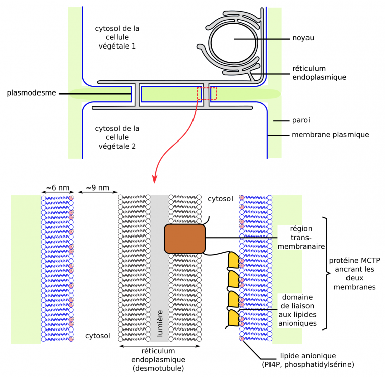 Les sites de contacts entre membranes sont stabilisés par des protéines interagissant avec les deux membranes. Ainsi, les sites de contacts entre membrane plasmique et réticulum endoplasmique (desmotubule) dans les plasmodesmes végétaux sont stabilisés par des protéines dont le domaine transmembranaire est ancré dans la membrane du réticulum, et dont le domaine cytosolique interagit avec des lipides anioniques (phosphatidylsérine, PI4P) de la membrane plasmique (Figure 16) [72]. Ces sites de contacts sont propices à la réalisation d’échanges de lipides entre membranes.