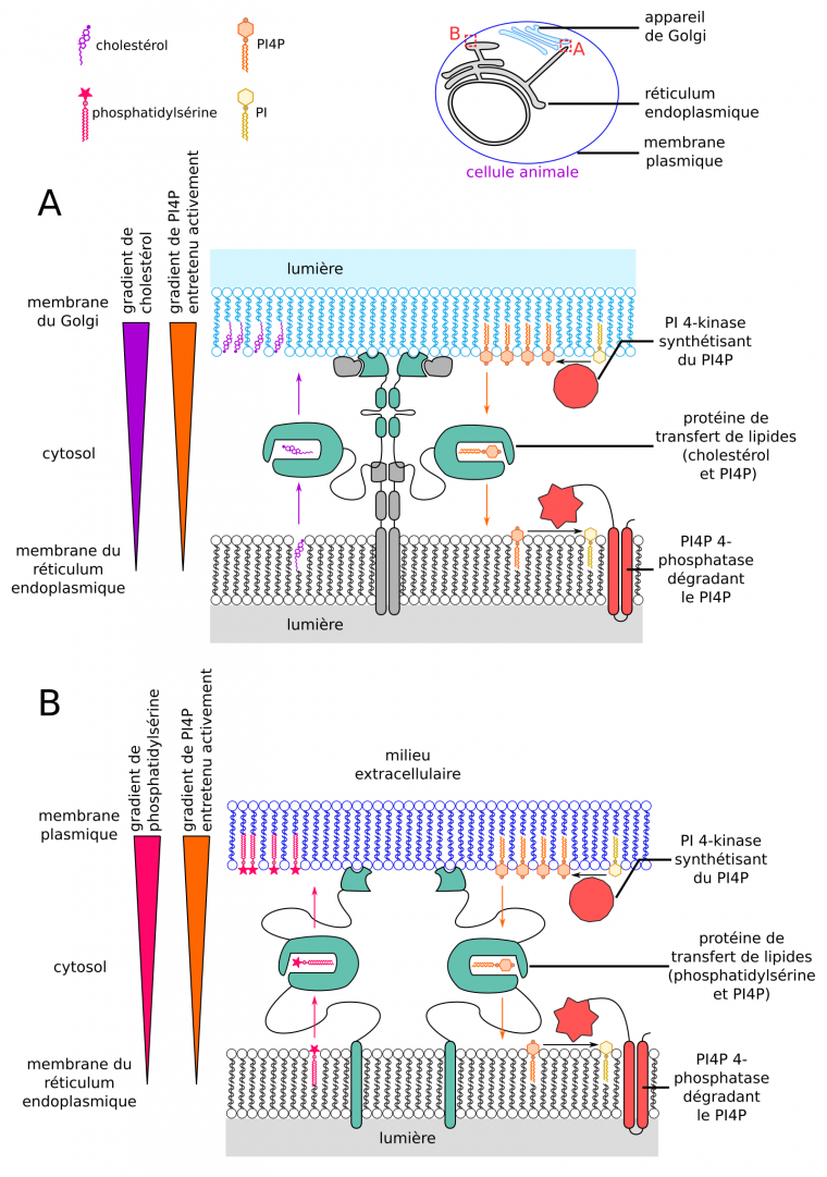 (A) Le cholestérol est transporté de la membrane du réticulum endoplasmique où il est synthétisé, à la membrane de saccules golgiens contre son gradient. Ce transport actif est possible grâce au gradient identique de PI4P qui est transporté passivement en sens inverse par les mêmes protéines de transfert de lipides. (B) De même, la phosphatidylsérine est transportée contre son gradient de la membrane du réticulum où elle est synthétisée à la membrane plasmique. D’après [92].