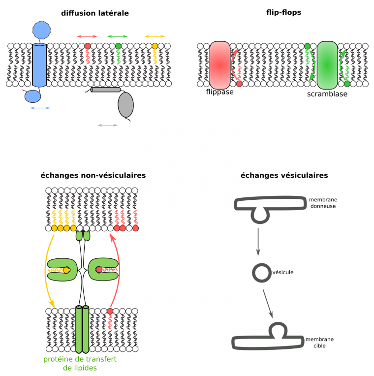 Les membranes biologiques réalisent de nombreux échanges, qui participent à leur dynamique par l’apport et le départ de composants membranaires. Ces échanges ont lieu par divers mécanismes, dont les transports vésiculaires de lipides et protéines, et les transports non vésiculaires dont l’importance critique émerge depuis une dizaine d’années. Des composés membranaires peuvent également s’associer transitoirement à une membrane, et d’autres peuvent subir un clivage relarguant deux fragments. Cette dynamique permet l’acheminement de biomolécules, notamment membranaires, de leur site de synthèse à leur localisation fonctionnelle, leur recyclage, des mécanismes de signalisation, etc.