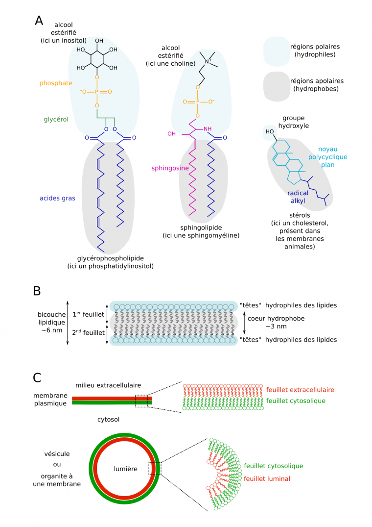 Différents lipides membranaires existent. Plus de la moitié sont des phospholipides : soit des esters de glycérol, d’acides gras et d’acide phosphorique (glycérophospholipides), soit des amides de sphingosine et d’un acide gras, estérifiés par un acide phosphorique (sphingolipides). Il existe aussi environ 30 % de stérols membranaires, dont le cholestérol des membranes animales, le sistostérol des végétaux, et l’ergostérol des Eumycètes [3]. Ils sont composés d’un noyau polycyclique lié d’un côté à une courte chaîne carbonée et de l’autre à un groupe hydroxyle −OH (fonction alcool). Les lipides membranaires partagent un caractère amphiphile, avec (i) une région polaire hydrophile interagissant avec le solvant aqueux ou d’autres groupes polaires, via des liaisons hydrogènes et d’autres interactions électrostatiques, et (ii) une région apolaire hydrophobe pouvant former des liaisons de Van der Waals avec d’autres groupes apolaires (Figure 2A).