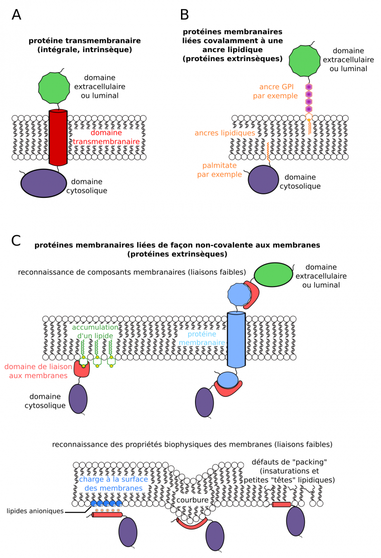 (A) Association aux membranes des protéines transmembranaires (intrinsèques, intégrales). (B) Association de protéines aux membranes par liaison covalente à une ancre lipidique (protéines périphériques, extrinsèques). (C) Association de protéines aux membranes par des liaisons non covalentes (protéines périphériques, extrinsèques).