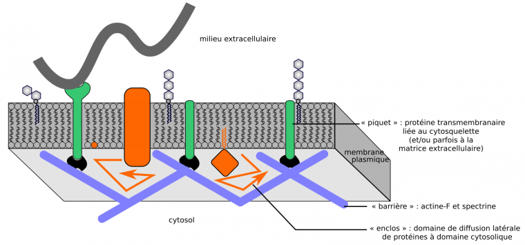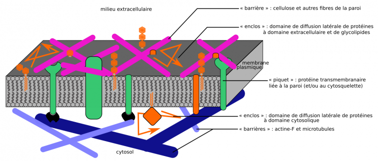 Dans les cellules animales également, la matrice extracellulaire peut contribuer à restreindre les possibilités de déplacement de protéines transmembranaires (interactions entre intégrines membranaires et fibronectines matricielles, par exemple, formant des « piquets »). Cet effet est néanmoins plus modeste que dans les cellules végétales, où la dynamique horizontale de la membrane plasmique peut se modéliser par un modèle plus complet de « barrières et piquets », où la paroi joue un rôle prédominant par rapport au cytosquelette. Tout lipide, protéine ou glycolipide extracellulaire y est ainsi susceptible d’interagir avec elle, et donc de se comporter comme piquet, et/ou de voir sa diffusion contrainte par la paroi qui agit comme barrière et forme des « enclos » (Figure 7) [21].