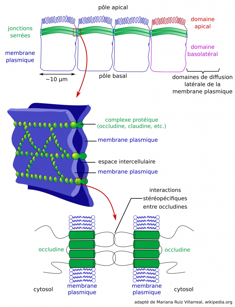 Les jonctions serrées des épithéliums animaux délimitent des domaines de diffusion latérale dans la membrane plasmique : un domaine apical et un domaine basolatéral (Figure 8). Ces jonctions forment un anneau dans la membrane plasmique des cellules épithéliales, et sont constituées notamment par les protéines transmembranaires claudines et occludines qui se lient entre elles et accolent ainsi les membranes plasmiques des cellules voisines, empêchant entre autres la diffusion latérale des protéines membranaires [43]. Les complexes protéiques des jonctions serrées interagissent par ailleurs avec le cytosquelette des cellules [43]. Ces jonctions permettent ainsi la présence de transporteurs transmembranaires distincts aux domaines apicaux et basolatéraux des épithéliums, et en conséquence un transport polarisé de solutés au travers du tissu épithélial.