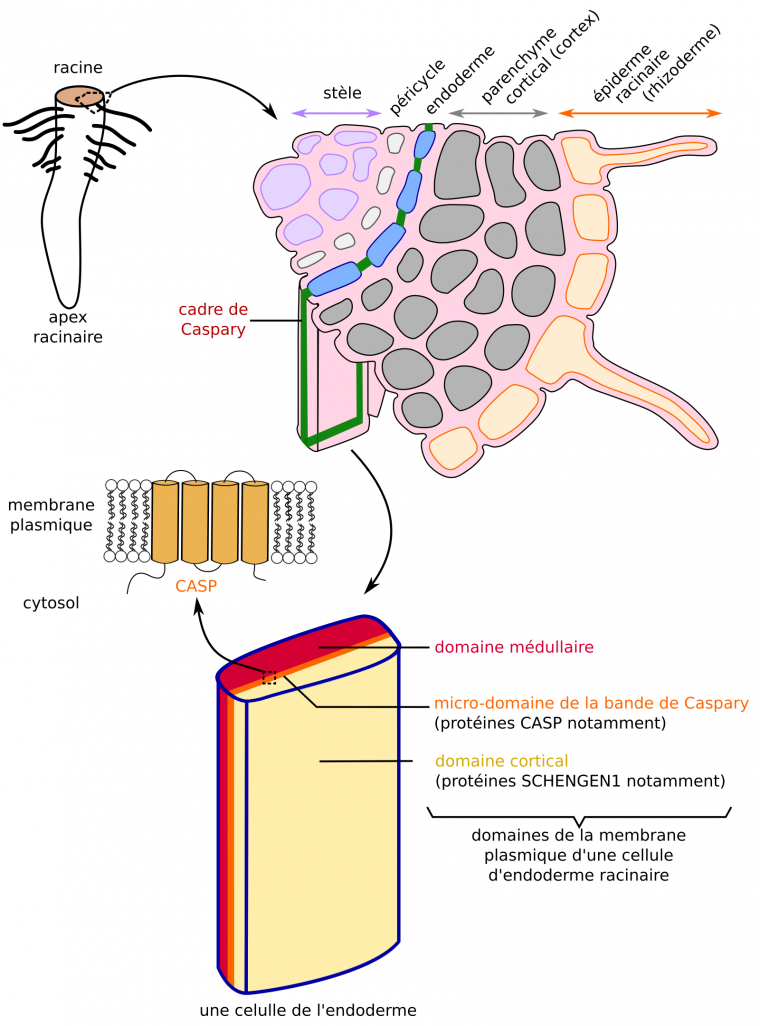 Au niveau du cadre de Caspary, l’accumulation de protéines CASP constitue un microdomaine qui agirait comme barrière à la diffusion latérale dans la membrane plasmique : il se forme un domaine cortical et un domaine médullaire.