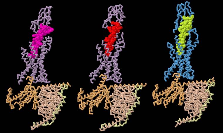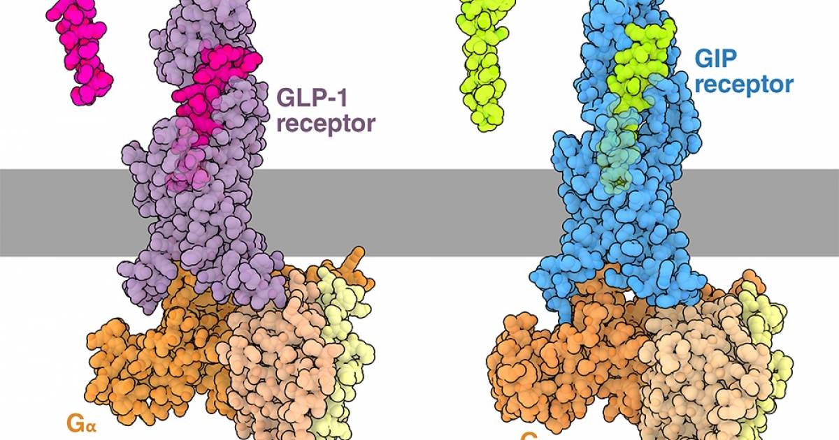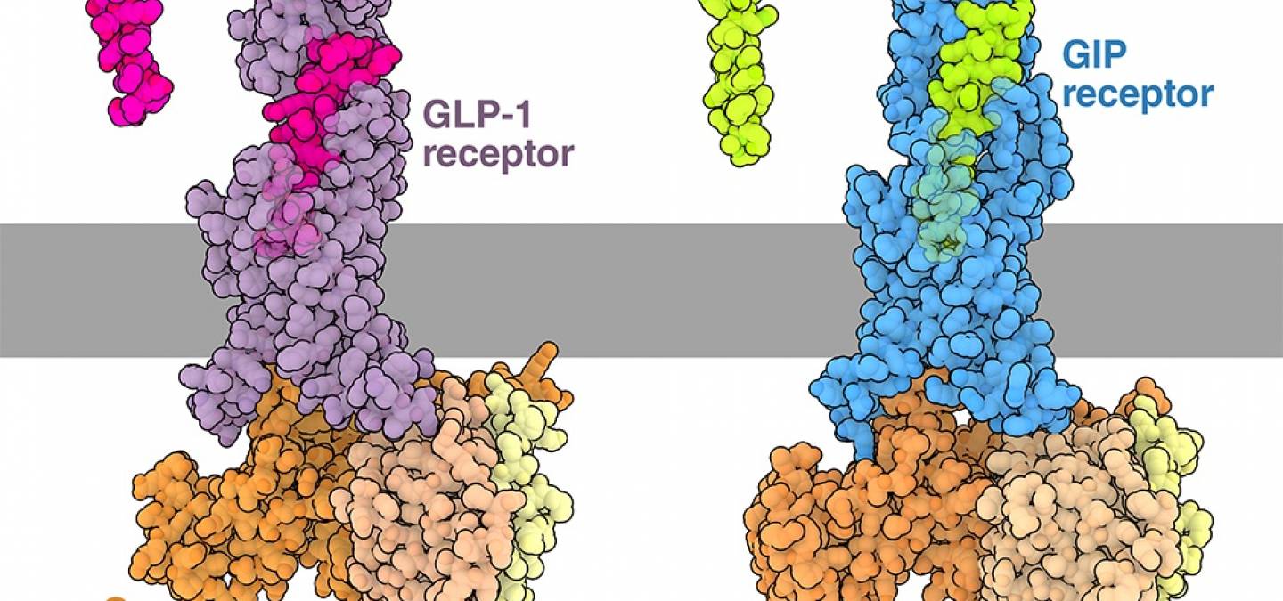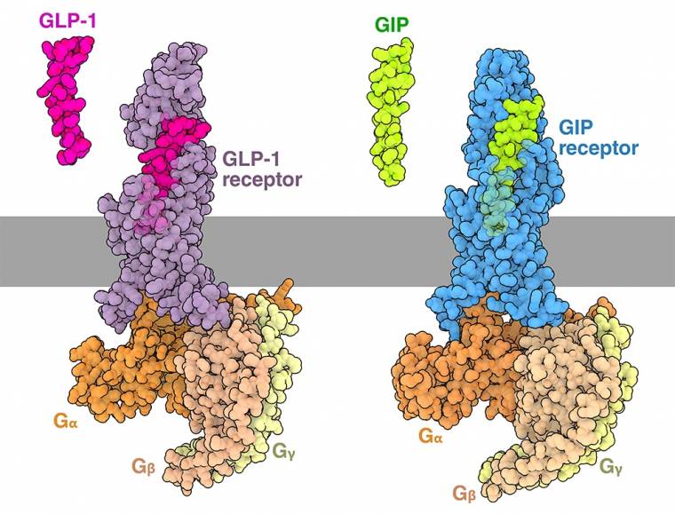 À gauche, l’hormone GLP-1 est représentée en rose dans son récepteur GLP-1R. Au centre, l’exendine, est représentée en rouge liée au même récepteur GLP-1R. À droite, l’hormone GIP est représentée en vert liée à son récepteur GIPR.