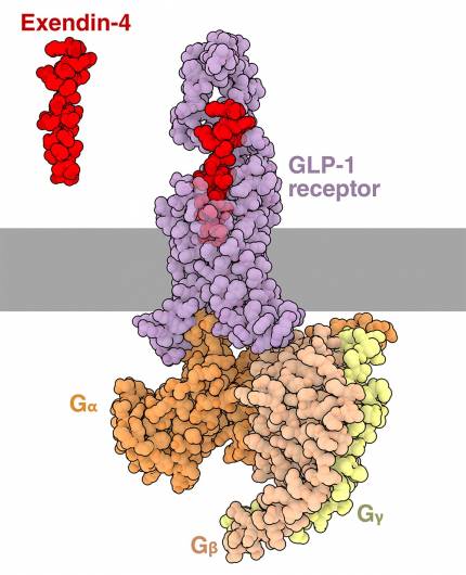L’exendine, représentée en rouge, se lie au récepteur GLP-1R, représenté en violet. Le récepteur couplé aux protéines G est associée à une protéine Gs, dont les trois sous-unités sont représentées en orange (alpha), saumon (bêta) et jaune (gamma).