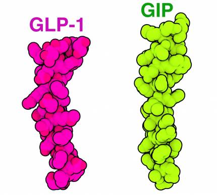 Le GLP-1 (entrée PDB 6B3J), l’exendine-4 (entrée PDB 7LLL) et le GIP (entrée PDB 7RA3) se lient aux récepteurs de manière similaire, une extrémité du peptide se liant profondément dans une poche du domaine transmembranaire du récepteur, et l’autre extrémité du peptide se liant au domaine extracellulaire. Vous pouvez examiner de plus près ces liaisons en vous rendant sur la page de l’article d’origine (en anglais), et en cliquant sur l’onglet JSmol de la section Exploring the structure.
