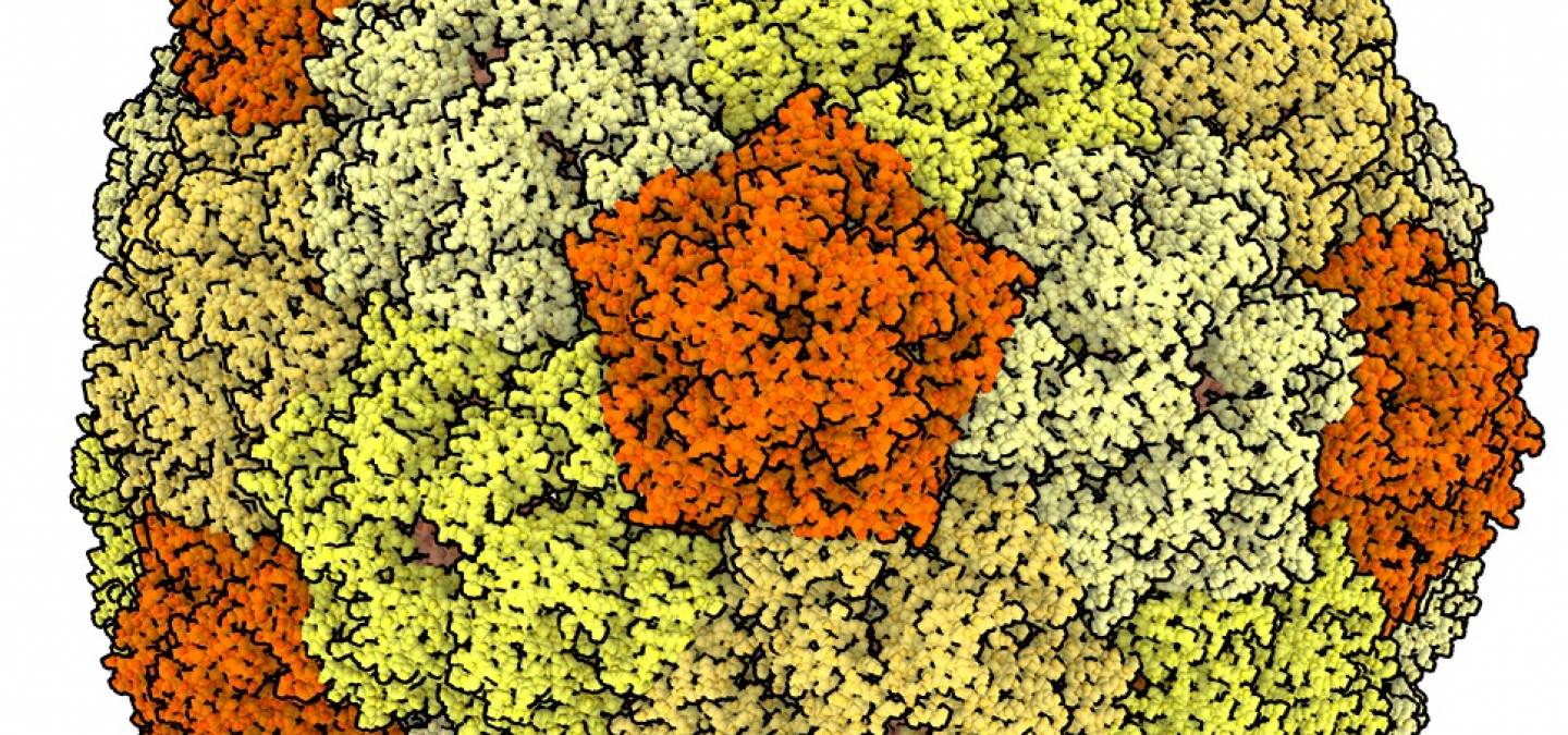 La protéine dArc1 (entrée PDB 6TAP), un homologue de la protéine Arc des mammifères présent chez les drosophiles, forme des capsides icosaédriques composées d'hexamères (représentés en jaune) et de pentamères (représentés en orange).