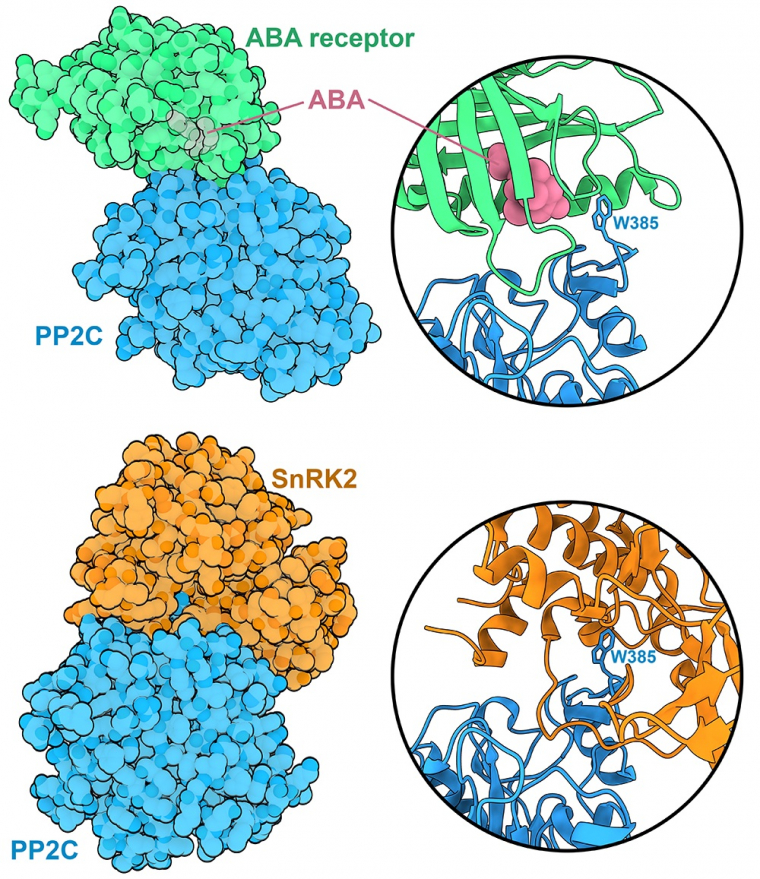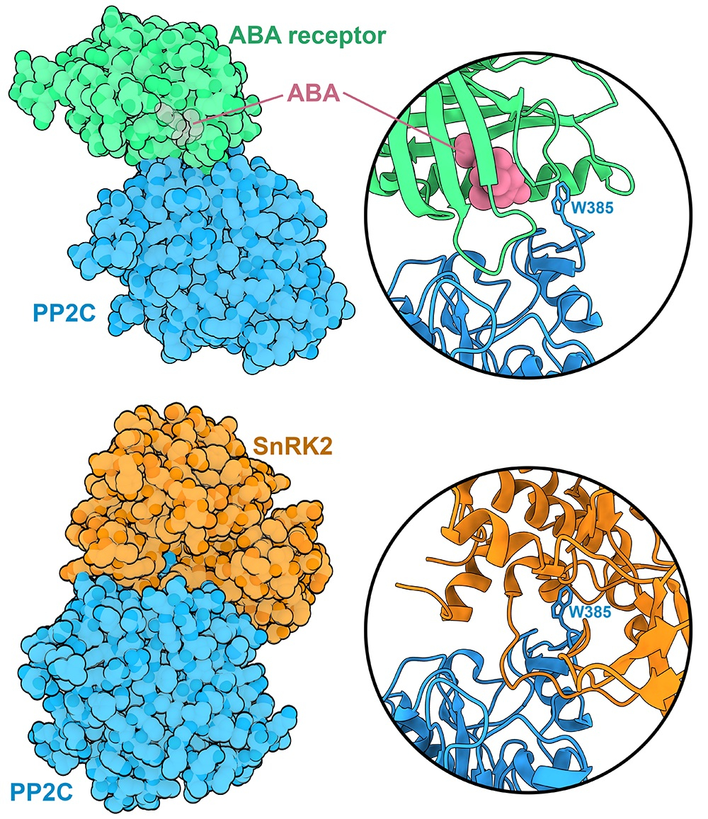 La phosphatase PP2C (représentée en bleu) se lie au récepteur ABA lié à l’acide abscissique (en vert, entrée PDB 3KB3) ainsi qu’à la protéine kinase SnRK2 (en orange, entrée PDB 3UJG). Les cercles à droite représentent une vue agrandie du site de liaison, mettant en évidence le rôle d’un tryptophane conservé (W385 dans la phosphatase PP2C HAB1).