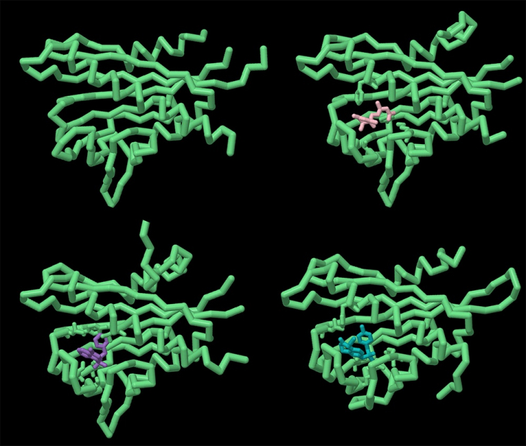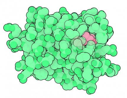 Bon nombre de ces réponses au stress sont induites par une voie de signalisation activée par l’acide abscissique (ABA), une petite hormone synthétisée par les tissus végétaux en conditions de sécheresse. L’acide abscissique se lie aux récepteurs ABA de la famille PYR/PYL/RCAR. Sur la figure 1, le récepteur à l’acide abscissique PYL1 d’Arabidopsis thaliana est représenté lié à l’acide abscissique, qui est coloré en rose (entrée de la banque de données des protéines (PDB) 3JRS). Le site de liaison de l’acide abscissique est une poche conservée dans la famille des récepteurs ABA et entourée de deux boucles, appelées « porte » et « loquet » 1. La liaison de l’acide abscissique « verrouille » la porte et le loquet. Vous pouvez examiner de plus près ce mécanisme de liaison en vous rendant sur la page de l’article d’origine (en anglais), et en cliquant sur l’onglet JSmol de la section Exploring the structure.