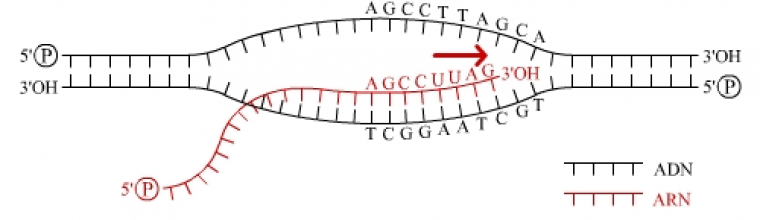 L'ARN polymérase lit le brin patron (ou brin antisens), qui est complémentaire du brin codant (ou brin sens), depuis son extrémité 3' vers son extrémité 5'. Le brin d'ARN néosynthétisé est donc identique au brin codant d'ADN, aux uraciles et riboses près.