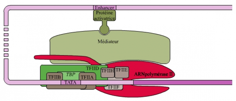 Le complexe d’initiation composé de l’ARNpol II et des différents TFII est suffisant pour obtenir une activité transcriptionnelle in vitro mais à très faible taux. L’augmentation de cette activité basale (ou sa répression) est sous la dépendance de facteurs spécifiques qui vont interagir avec le complexe d’initiation. Ces protéines activatrices ou inhibitrices (éléments trans-régulateurs) se lient à des promoteurs distaux spécifiques (séquences cis-régulatrices) de l’ADN, appelées amplificateurs (enhancers) lorsqu’ils recrutent des cofacteurs activateurs, ou silenceurs (silencers) lorsqu’ils recrutent des cofacteurs inhibiteurs. Ces promoteurs distaux peuvent être situés à des milliers de nucléotides du promoteur proximal. Malgré la distance qui sépare les promoteurs proximaux des promoteurs distaux, ces derniers agissent sur le promoteur proximal par le jeu de courbures de l’ADN, des facteurs de transcription et du médiateur qui maintient liés tous ces acteurs (voir fig. 2).