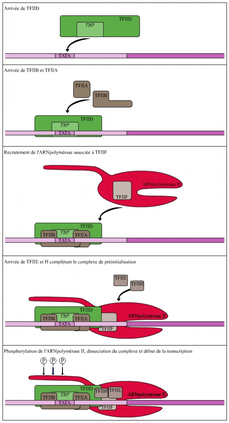 La TBP est la première protéine qui reconnaît une séquence spécifique de l'ADN initiatrice de la transcription (la boite TATA). Le facteur TFIIB semble impliqué dans la sélection précise du site d'initiation (nucléotide à partir duquel se déroule la transcription). Le facteur TFIIH comporte plusieurs activités enzymatiques dont une activité hélicase permettant l'ouverture de la double hélice d'ADN au niveau du promoteur, et une activité kinase responsable de la phosphorylation de la queue C-terminale de l'ARN polymérase II. Cette phosphorylation provoque une modification de la structure tridimensionnelle de l'ARN polymérase qui entraîne la dissociation du complexe d'initiation et le début de la transcription.