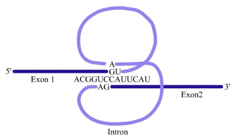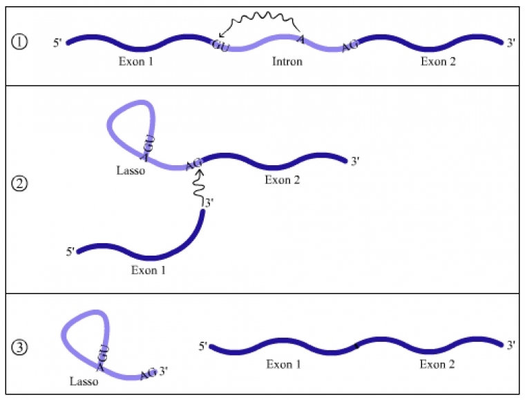 L'excision-épissage est réalisée par réaction d'un nucléotide à adénine (A) situé dans l'intron avec un nucléotide à guanine situé en 5' de l'intron. Cela entraîne la séparation de l'intron d'avec l'exon 1 (situé en amont) et la formation d'une structure en lasso interne à l'intron. Ensuite, l'extrémité 3' de l'exon 1 réagit avec l'extrémité 5' de l'exon 2 permettant l'épissage des deux exons et la libération du lasso qui sera dégradé par des ribonucléases.
