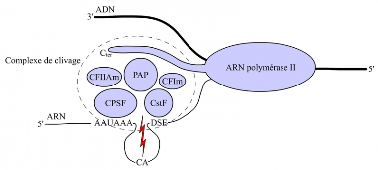 Le site de polyadénylation est codé au niveau du gène. Le site de clivage déterminé par le dinucléotide CA est entouré par une séquence AAUAAA très conservée, située 10 à 30 nucléotides en amont du site de clivage, et par une séquence DSE (DownStream Element) riche en U ou en GU, situé une trentaine de nucléotides en aval du site de clivage. La séquence AAUAAA est reconnue spécifiquement par un complexe protéique appelé CPSF (Cleavage and Polyadenylation Specific Factor), et la séquence DSE par un complexe CstF (Cleavage Stimulation Factor). Ces deux complexes et d’autres composants, comme l’ARN polymérase II et la poly(A) polymérase (PAP), vont interagit en formant le complexe de clivage qui va cliver la molécule de préARN au niveau du site de clivage (voir fig. 8).