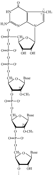 Elle a lieu dès le début de la transcription avant que la chaîne ne compte plus de 30 nucléotides. Elle consiste en l’ajout d’un nucléotide à guanine sur l’extrémité 5' de l’ARN suivi de sa méthylation sur l’azote 7 de la base, ainsi que de la méthylation en 2' du ribose du premier ou des deux premiers nucléotides du transcrit primaire. La particularité de cet ajout consiste dans le type de liaison mis en jeu : au lieu d'être reliés par une liaison ester-phosphorique entre le groupement OH porté par le carbone 3' du ribose du nucléotide à guanine et l'acide phosphorique alpha du premier nucléotide de l'ARN natif, les deux nucléotides sont reliés par une liaison anhydride d'acide entre les acides phosphoriques des deux nucléotides.